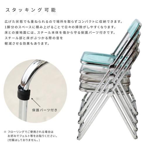 スケルトン折りたたみチェア / cleirier【クレーリエ】は、シンプルなデザインにシルバーフレームを組み合わせることで、スケルトン素材のインテリアにシャープさをプラスした、スタイリッシュなチェアです。透明素材を使うことで、空間に馴染みやすく、さまざまなインテリアスタイルとも相性抜群です。