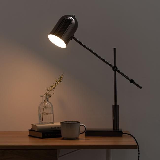 高級感漂うメタリックデザインが目を引く、Form デスクライト506。アーム部分の直線的なデザインと、シェード部分の丸みを帯びたフォルムが絶妙なバランスを生み出し、インダストリアルな雰囲気を醸し出しながら清潔感も感じさせます。